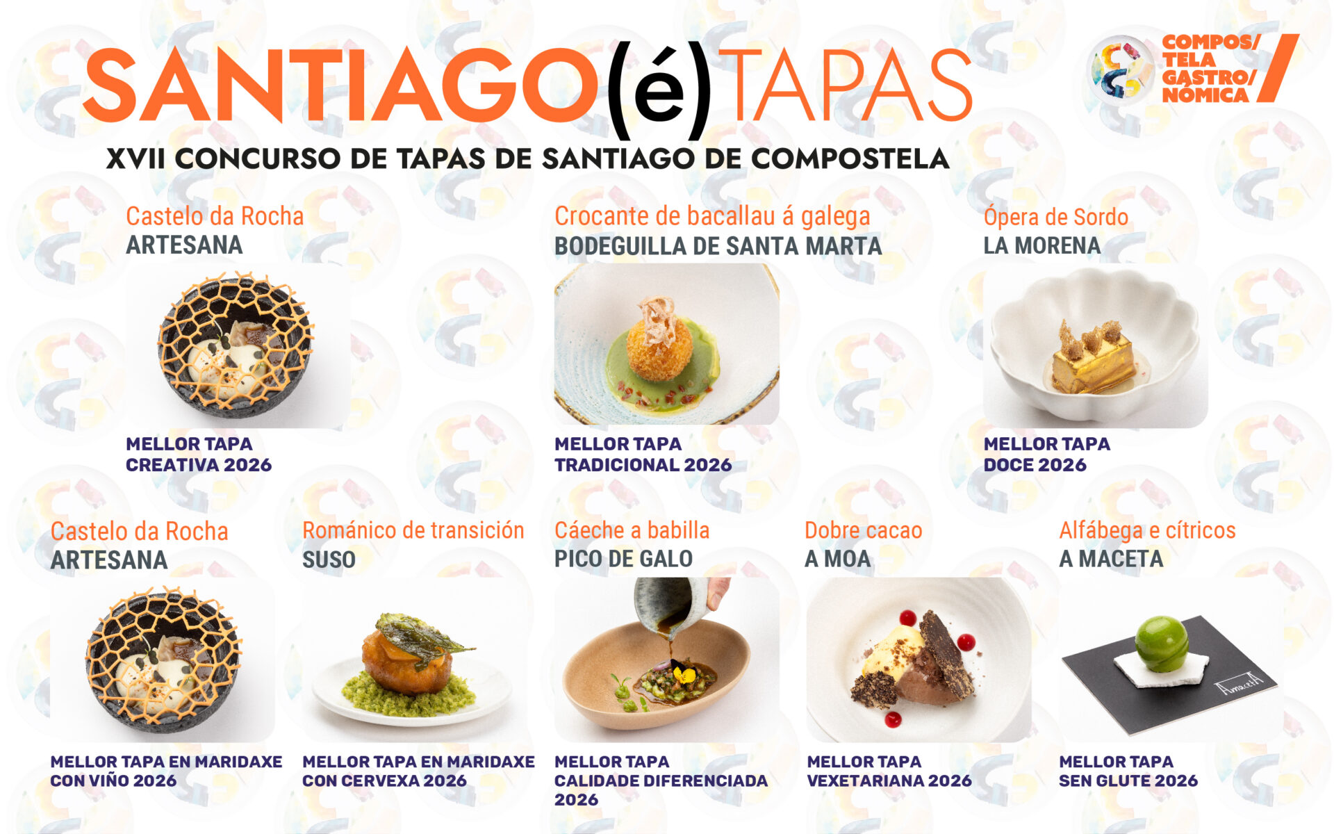 Tamén recibiron unha chaquetiña cortesía da empresa Allwork, os 10 locais finalistas que foron, por orde alfabética, A Maceta, con ‘Alfábega e cítricos’; A Moa, con Dobre cacao’; Artesana, coa tapa ‘Castelo da Rocha’; Bodeguilla de Santa Marta, con ‘Crocante de bacallau á galega’; El Rincón de Yobeida, con ‘Tropicacheira’; La Morena, con ‘Ópera de Sordo’; Orixe, con ‘Cordeiro de Dior’; O Sendeiro, con ‘Macaron de Santiago’; Pico de Galo, con ‘Cáeche a babilla’ e Suso, con ‘Románico de transición’.